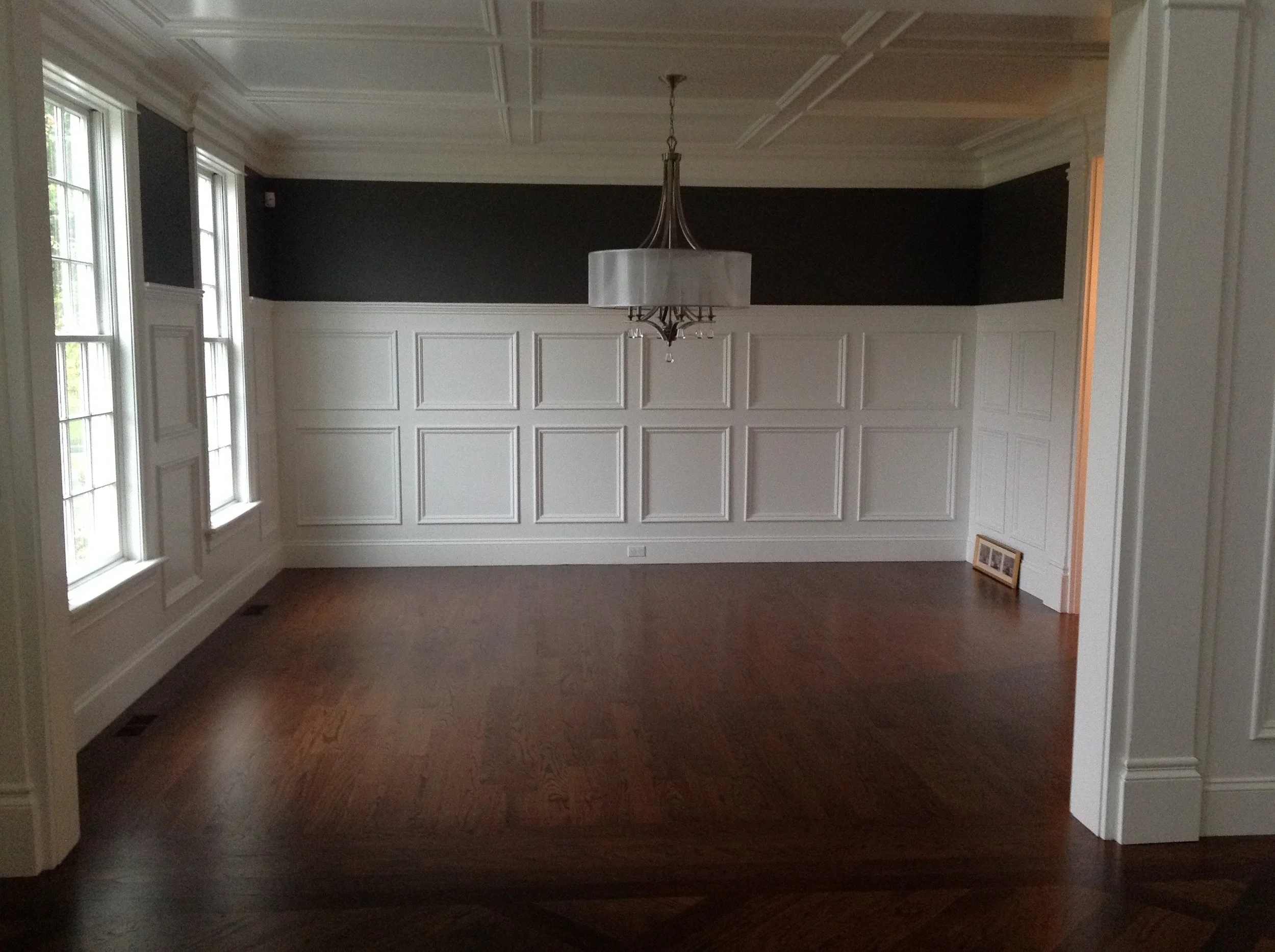 The challenge for this dining room was the gold painted crown moulding and the gold painted picture-frame paneling. The homeowner wanted traditional wainscoting, so we removed the wallpaper and simple wood paneling and replaced it with built-out wainscoting in the appropriate scale. Additionally, we added woven fabric wall covering and a traditional crystal chandelier. Finally, we stained the hardwood a custom dark walnut to enhance the homeowners cherry dining table.