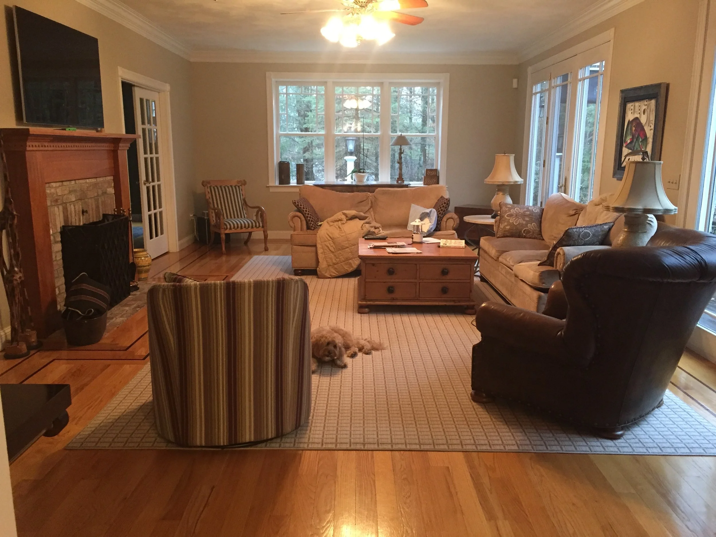 This outdated family room, with oversized furniture, didn’t appeal to the family any longer. By removing the window grills, painting the walls, trim and boxing in the ceiling beams, we were able to present a cohesive palette. Now with ample seating and a clean design, the family can enjoy time together.