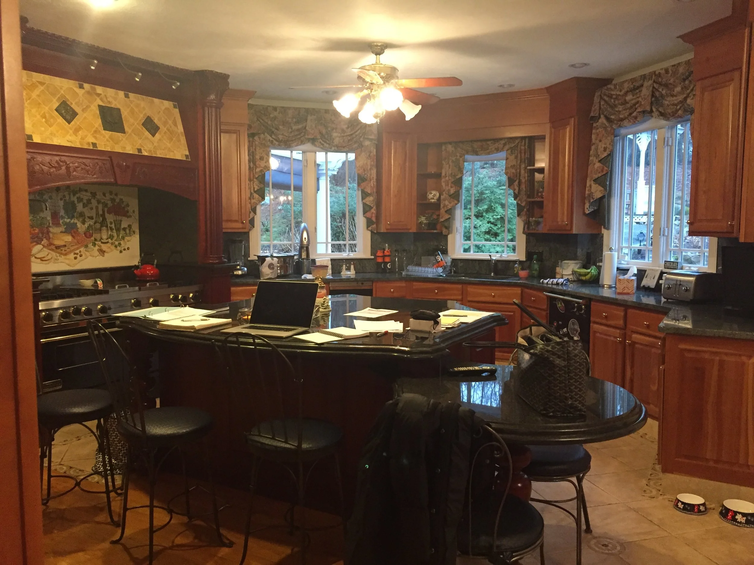 The challenge for this dated kitchen was to increase the light from the south facing windows and to work within the angled walls. To make the kitchen feel lighter, the windows were split apart and custom off-white cabinets were installed. The glass sliding cabinet doors allow for light reflection, while the mostly white iron stone pottery presents a cohesive palette. The polished marble counter tops on the island and perimeter bounce light and the darkly stained floor reflects the light upward.