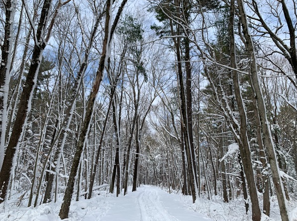 While snowshoeing a few weeks back, I came across a scene that stopped me in my tracks (see photo at the end of this post). I was awestruck by the beauty of this cathedral to nature: the graceful trees leaning in towards each other, the snowy white floor and the blue sky peeking through the clouds.